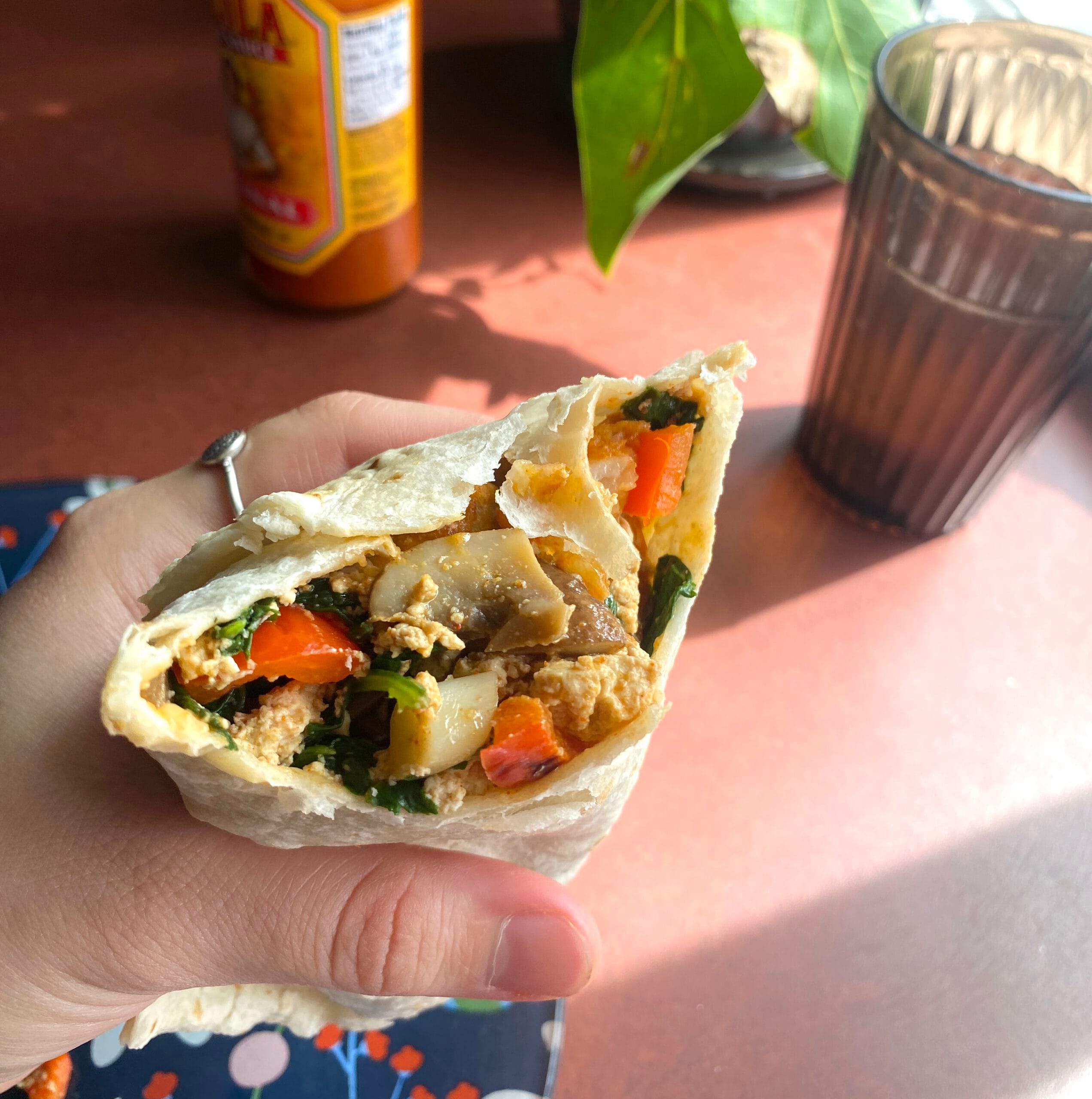 A filling, easy vegan breakfast that makes the most of any vegetables you have laying around.. Tofu provides protein, while spinach, onions, and optional veggies add fiber and nutrients. Flavored with garlic, nutritional yeast, and spices, all wrapped in a tortilla. Quick, versatile, and satisfying.