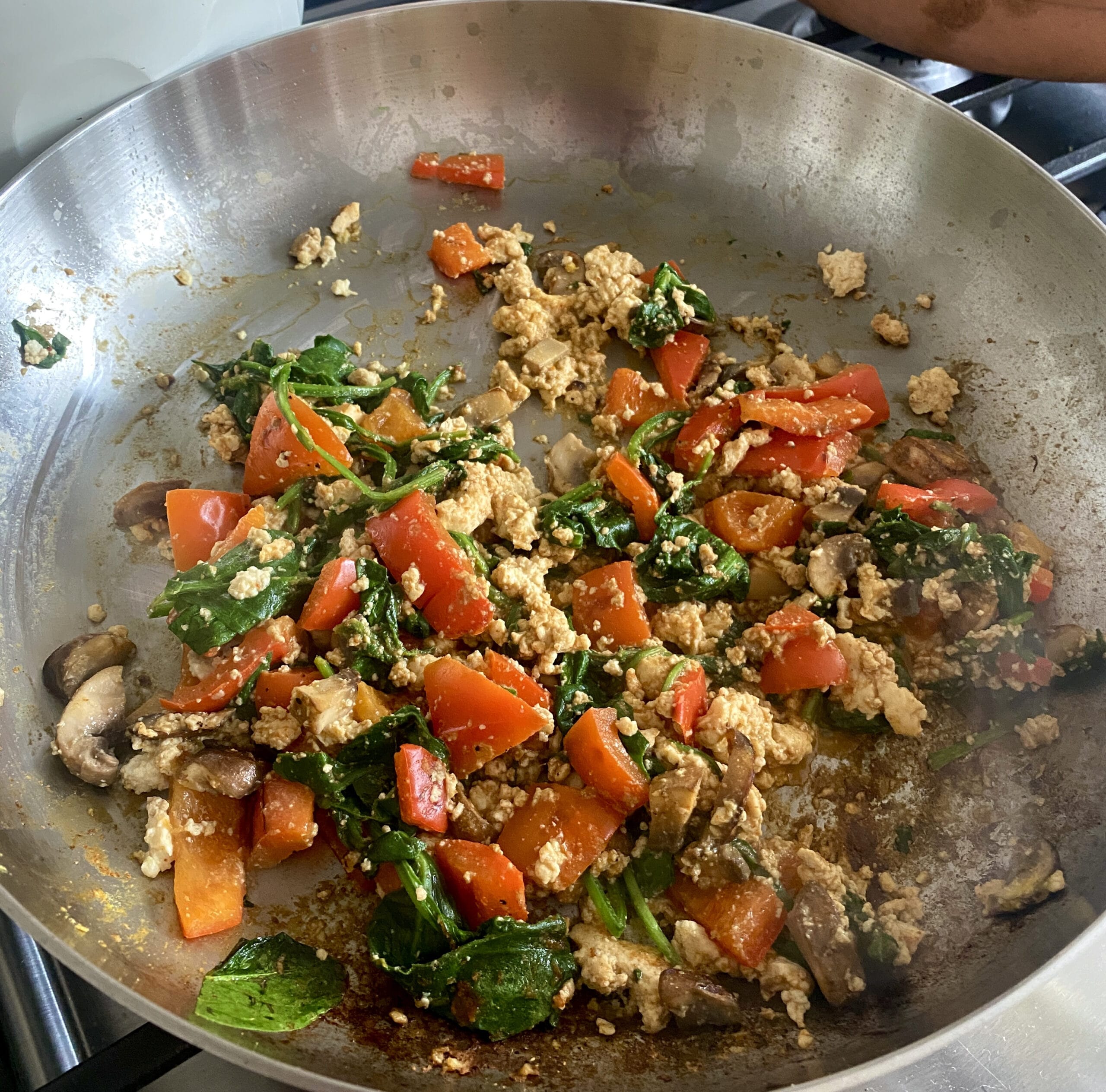 I’m cutting back on gluten & had this as a scramble :) I used spinach, red pepper, onions & mushrooms