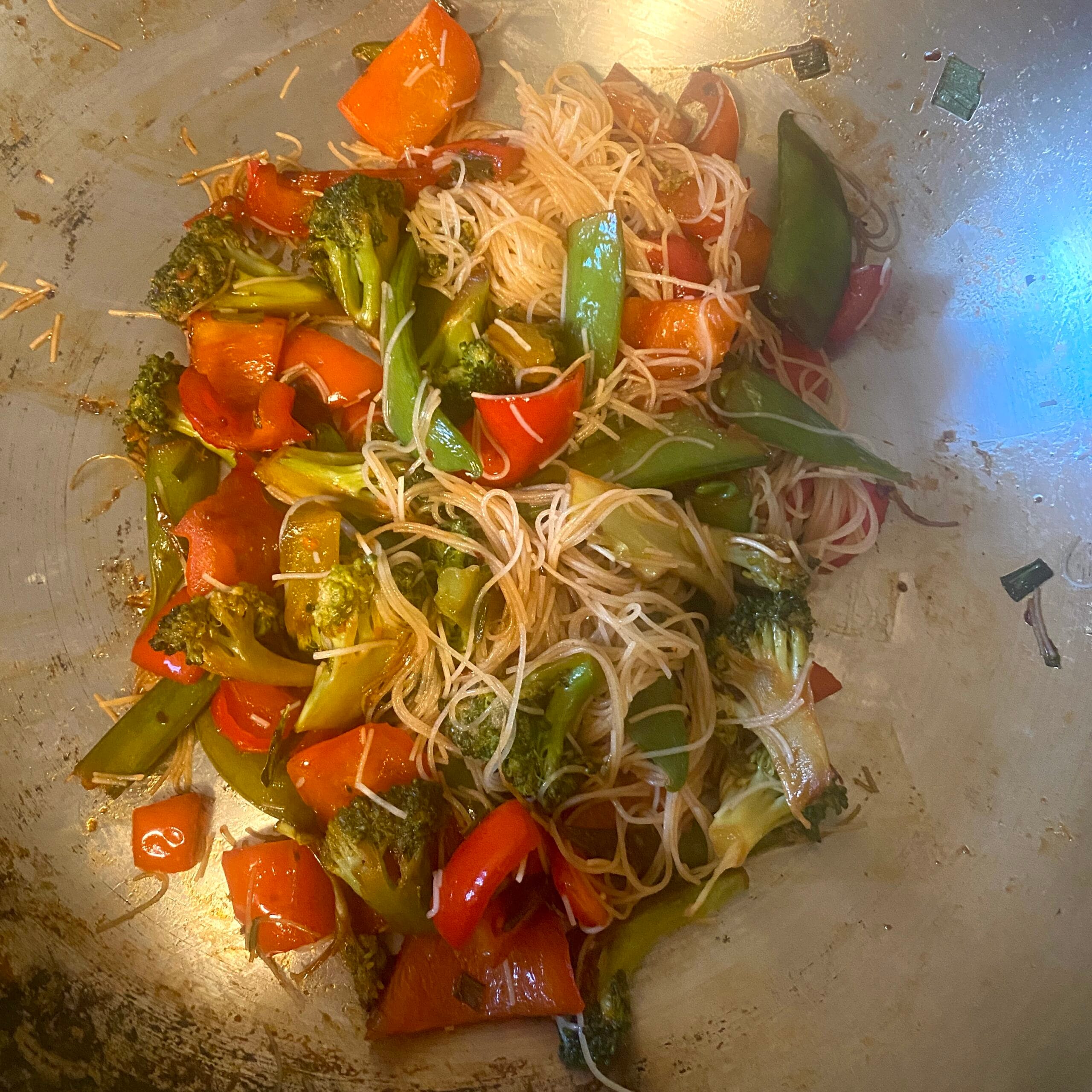 - Add noodles and sauce ingredients. Saute for 2 minutes. Enjoy!1 tsp Sesame Oil, 1 tsp Maple Syrup, 1 tbsp Soy Sauce, 1 tbsp Rice Vinegar, 1 tsp Garlic Powder